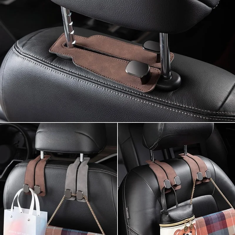 【Dupla akasztó a fejtámlához - Alcantara akasztó】 - A puha bőr fejtámla-akasztó jobban illeszkedik az autóüléshez, így a fejtámlát kényelmes tárolóhellyé alakítja élelmiszerek, ruhák, kézitáskák, kalapok stb. tárolására, így az utasoknak is van hely a hátsó részen.