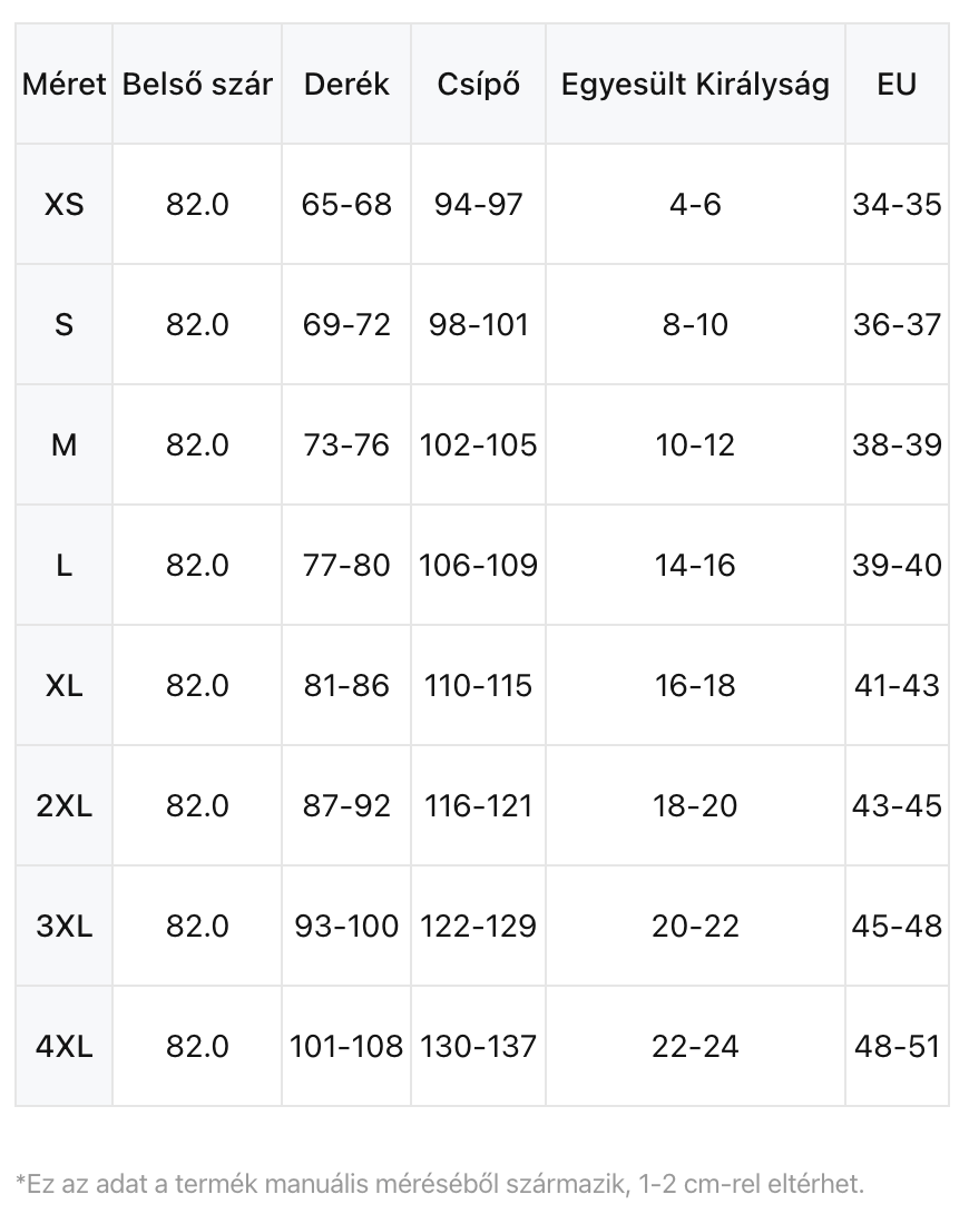 Mérettáblázat